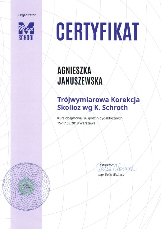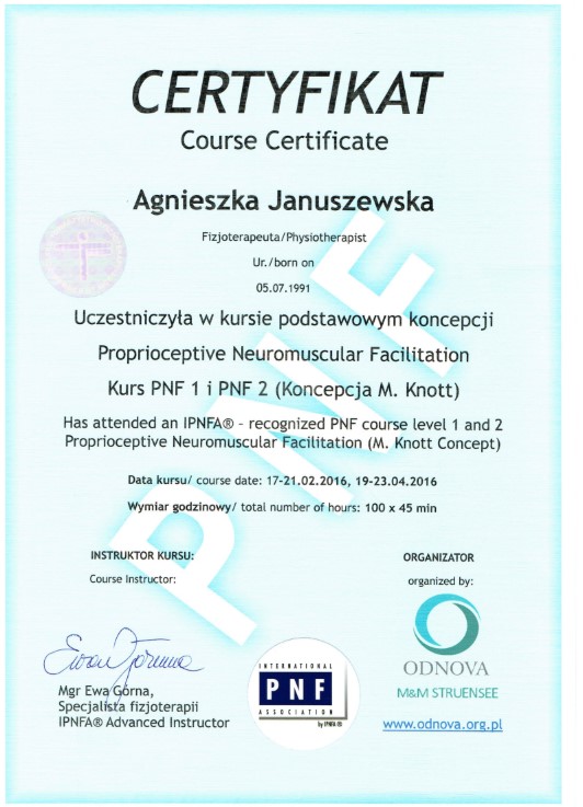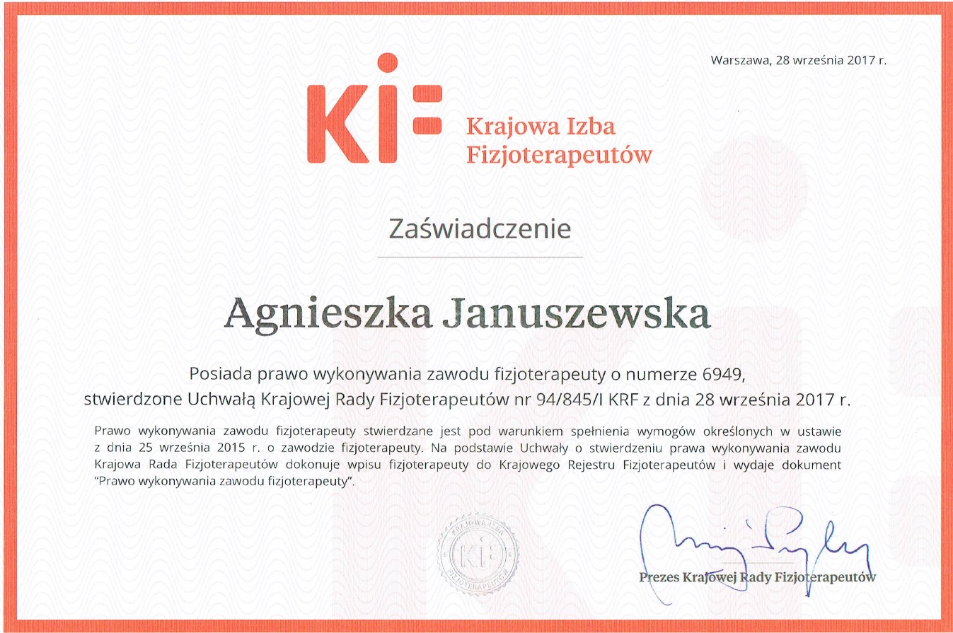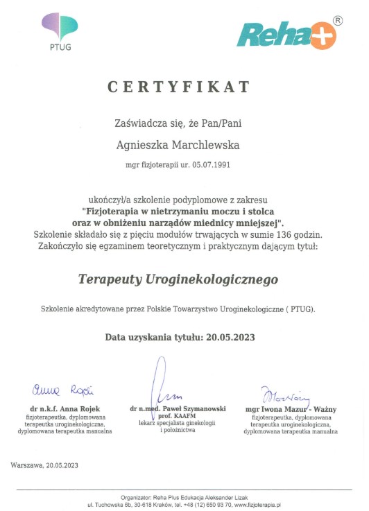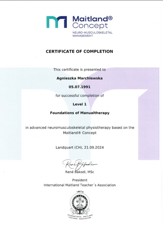 Każdy pacjent, niezależnie od wieku, może liczyć na kompleksową diagnozę, spersonalizowany plan terapii oraz wsparcie na każdym etapie powrotu do zdrowia. Agnieszka Marchlewska regularnie podnosi swoje kwalifikacje, uczestnicząc w licznych szkoleniach i kursach, aby zawsze oferować nowoczesne i skuteczne metody leczenia.